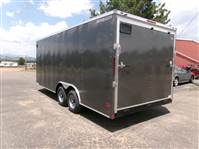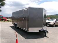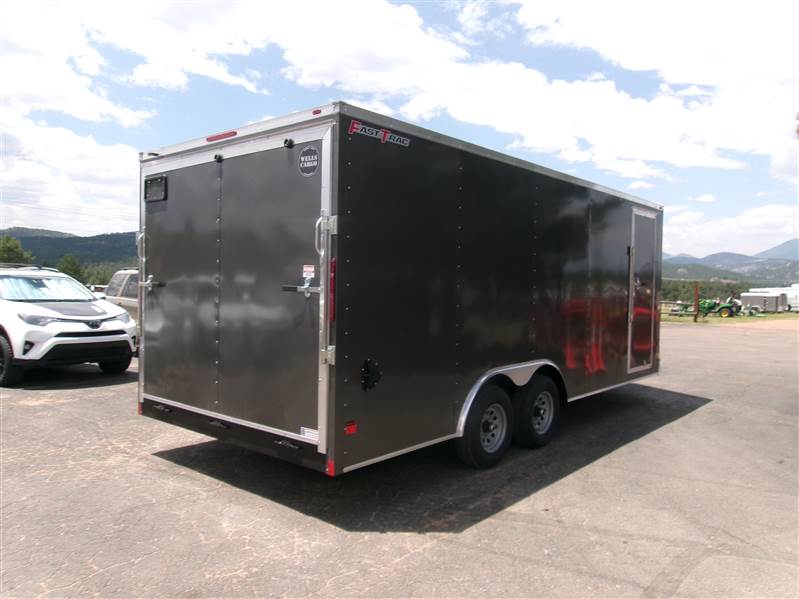 FLOORING CLEARANCE SALE: 2026 20' enclosed cargo trailer by Wells Cargo (Model FastTrac), measures 8'5” x 20' (square section), 18" V-nose front (extra foot inside), rear ramp door with 16” ramp extension, 7’ inside Height, side door with grab handle, RV door latch and bar lock assembly, deluxe finish (0.30 exterior, 3/8 Plexcore sidewall), side wall vents, dome light, tandem 5200# axles with easy lube hubs, electric brakes on both axles, GVWR - 9990#, Payload = 6870# (trailer weight 3120#), 15" radial tires (225 75R15), FREE matching spare tire, 16” stone guard, LED lights, 4 5000# square welded corner ties, 12” drop down stabilization jacks, exterior color = White.