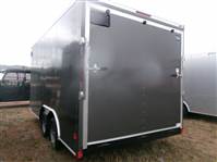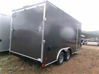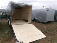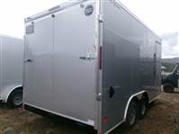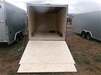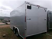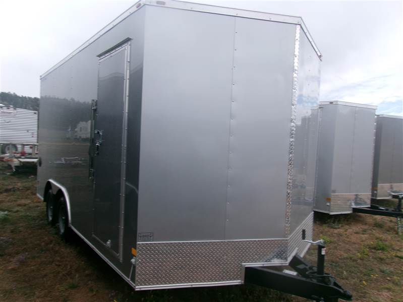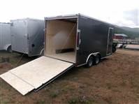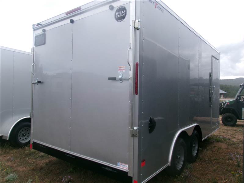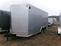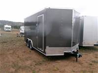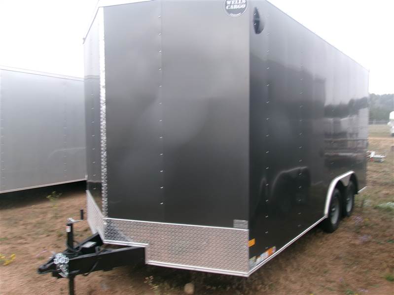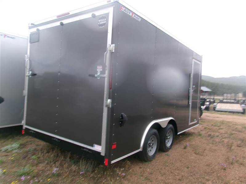 REDUCED: 2026 16' enclosed cargo trailer by Wells Cargo (Model FastTrac), measures 8'6” x 16' (square section), 18" V-nose front (extra foot inside), rear ramp door with 16” ramp extension, 7’6” inside height, 32” side door with grab handle, RV door latch and bar lock assembly, deluxe finish (0.30 exterior, 3/8 Plexcore sidewall), side wall vents, dome light, tandem 3500# axles with easy lube hubs, electric brakes on both axles, GVWR - 7000#, Payload = 4180# (trailer weight 2820#), 15" radial tires (205 75R15), matching spare tire, 16' stone guard, LED lights, 4 5000# square welded corner ties, 12” drop down stabilization jacks, exterior color = Charcoal Gray or Silverfrost.