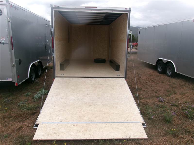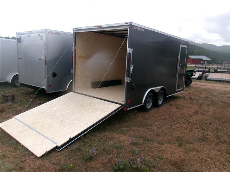 FAST TRAC TRAILER SPECS: Floor Frame: 16” O/C; Entire Chassis Undercoated; 32” Wide Side Door; Vertical Post Frame: 16” O/C; 3/4” PlexCore Decking; .030 Aluminum Exterior –screws; Roof Bows: 24” O/C; 3/8” PlexCore Sidewall Liner; Roof: 1 piece Aluminum; Axle: Spring and E-Z Lube Hubs; Warranty: 1 year.