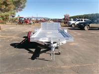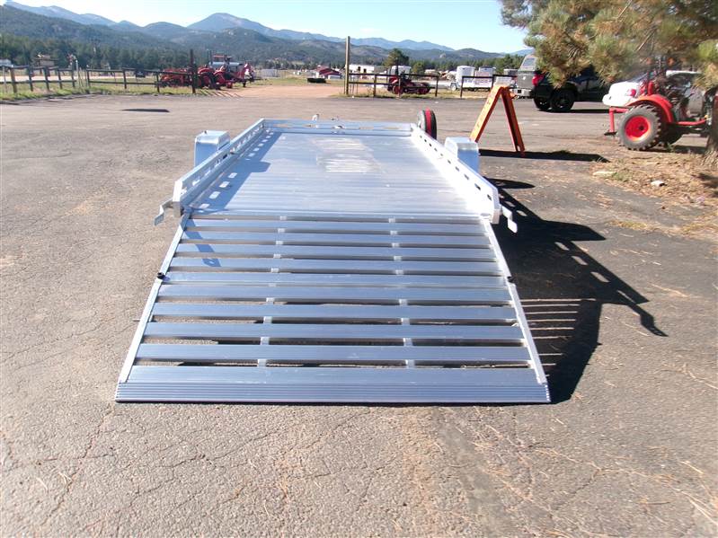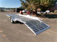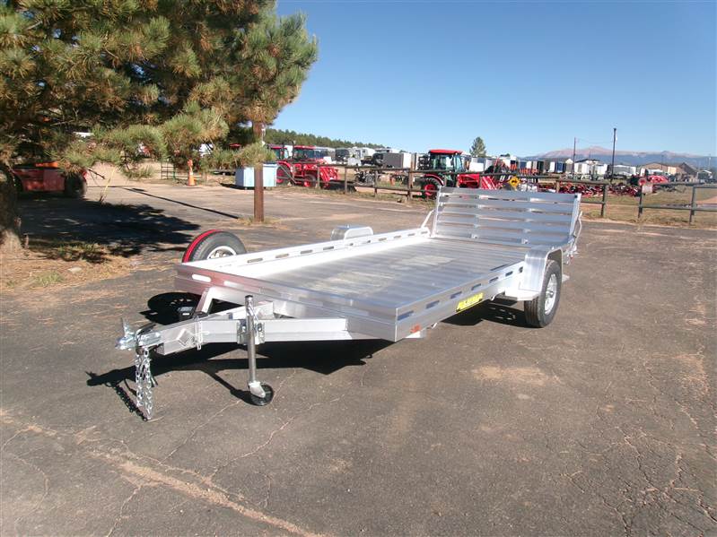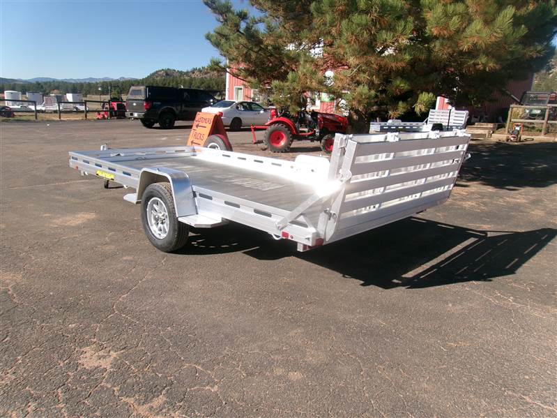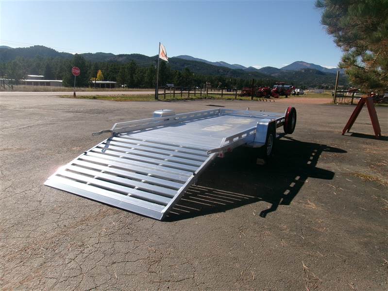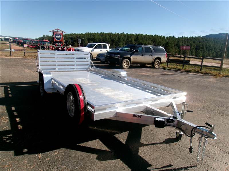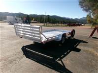 REDUCED: 2026 14' Aluminum Utility trailer (Model 8014BT), 81"W x 172.5”L, 8.5” front and side retaining rail, 7 tie down loops (3 per side and 1 in front), 60” rear bifold tailgate, tongue handle, fender steps, LED lights, 15" radial tires with aluminum wheels, matching spare and mount, 4400# torsion axle with easy lube hubs, electric brakes on axle, GVWR = 4250, payload – 3313# (trailer weight - 937#), Aluma exclusive 5 year warranty.