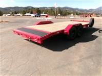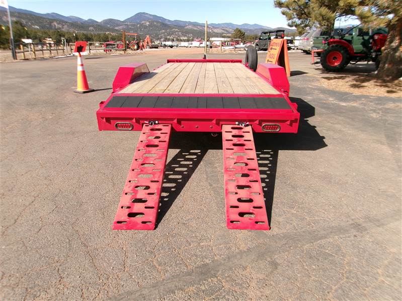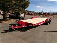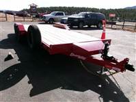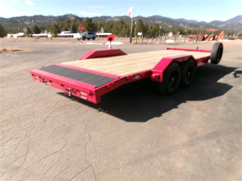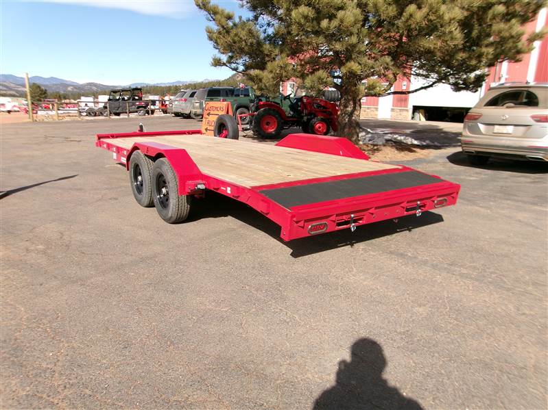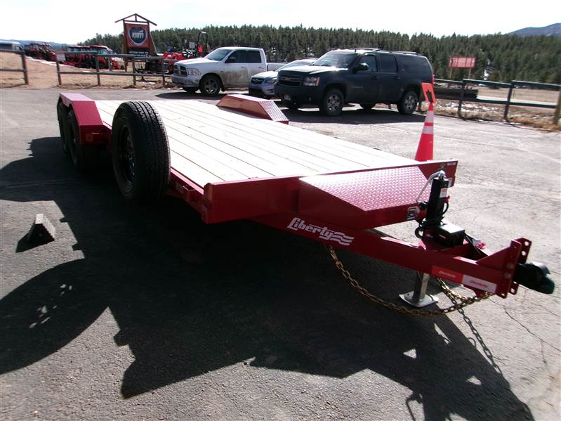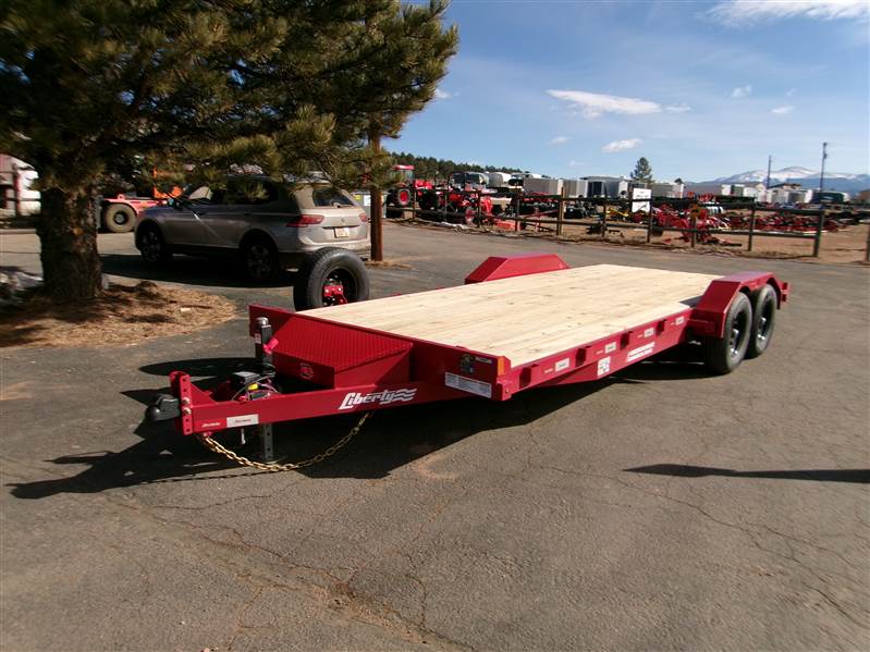 REDUCED: 2026 20’ Flatbed by Liberty Trailer, trailer measures 83” W x 20’L (18' flat deck and 2' dovetail), tandem 5200# axles with easy lube hubs, electric brakes on both axles, A Frame adjustable 2 5/16 Coupler, 7K drop leg jack, pull out rear pocket ramps, metal toolbox on tongue, GVWR = 9990#, Payload = 7500# (trailer weight 2490#), stake pockets, LED lights, treated pine decking, 15" radial tires (225 75R15), matching spare tire and mount, 1 year manufacturer warranty by Liberty. Color = Black and Patriot Red