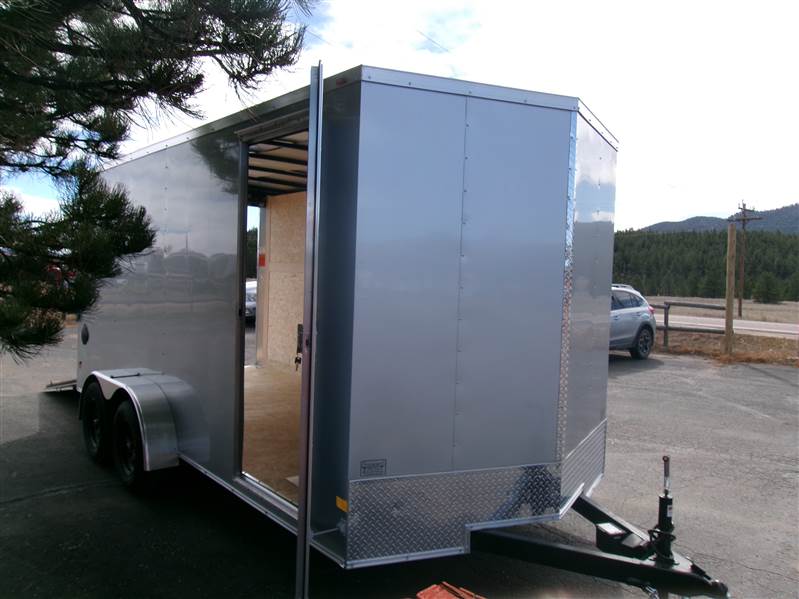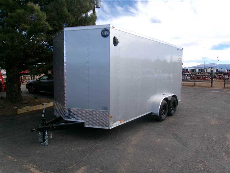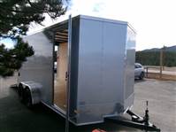 REDUCED: 2026 16' Enclosed V-nose cargo trailers by Wells Cargo (Model FastTrac), measures 7' x 16' (square section), 18" V-nose front (extra foot inside), deluxe finish (0.30 exterior walls, 3/8” Plexcore sidewalls, ¾” Plexcore floor), side wall vents, dome light, 16" stone guard, 3500# axle with easy lube hubs, electric brakes on both axles, GVWR - 7000#, Payload = 4680# (trailer weight 2320#), 15" radial tires (205 75R15), matching spare tire, 16' stone guard, rear drop down stabilization jacks, variety of colors and features.