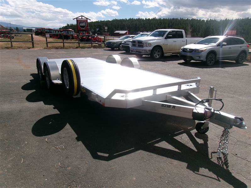 REDUCED: 2026 18' Aluminum Car Hauler by Aluma (Model 8218), measures 81” x 220”, tandem 3500# rubber torsion axle with easy lube hubs, electric brakes on both axles, 6’ rear ramps in pockets, rear stabilization jacks, removable aluminum teardrop fenders, front retaining rail, 4 5000# recessed tie rings, 6 stake pockets (3 per side), 14" radial tires with aluminum wheels, matching spare with side mount, GVWR = 7000, payload – 5575# (trailer weight - 1425#), Aluma exclusive 5 year frame warranty.