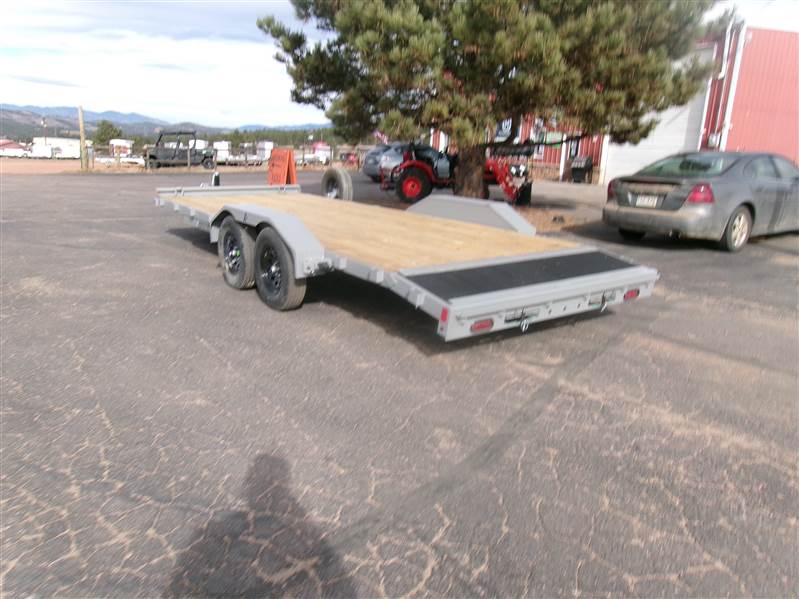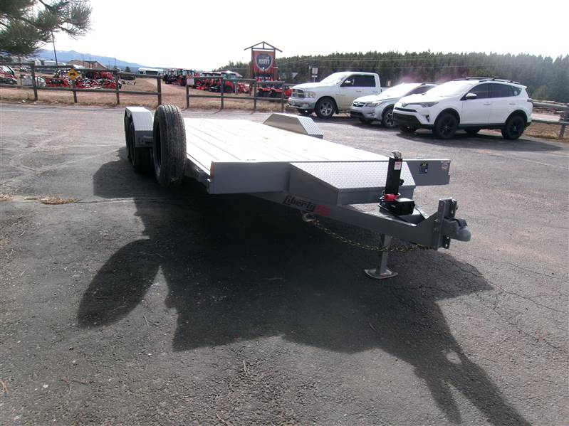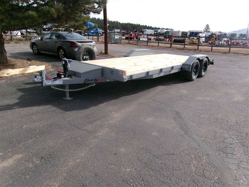 REDUCED: 2026 20’ Flatbed by Liberty Trailer, trailer measures 83” W x 20’L (18' flat deck and 2' dovetail), tandem 3500# axles with easy lube hubs, toolbox, stake pockets, LED lights, treated pine decking, electric brakes on both axles, A Frame 2 5/16 Adjustable Coupler, 7K drop leg jack, pull out pocket ramps, GVWR = 7000#, Payload = 4780# (trailer weight 2220#), 15" radial tires (205 75R15), matching spare tire and mount, 1 year manufacturer warranty by Liberty, color = Black or Gray.
