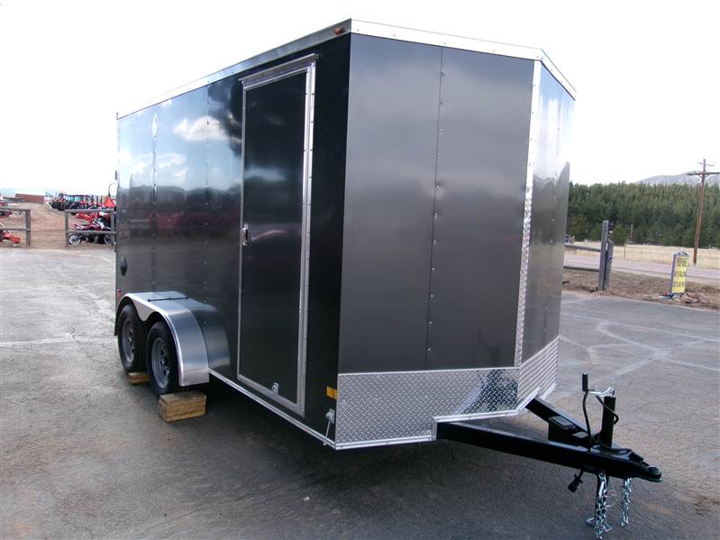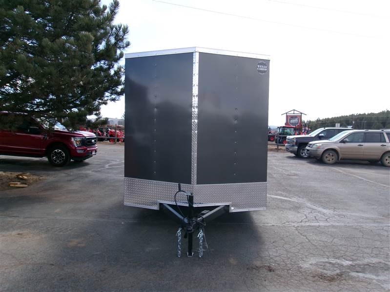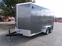 REDUCED: 2026 14' Enclosed cargo trailer by Wells Cargo (Model FastTrac Deluxe), measures 7' x 14' (square section), 18" V-nose front (extra foot inside), 7' inside Height, rear ramp door, 32” side door with RV door latch, deluxe finish (0.30 exterior, 3/8 Plexcore sidewall), side wall vents, 16" stone guard, LED lights, tandem 3500# axles with easy lube hubs, electric brakes on both axles, 15" radial tires (205 75R15), matching spare tire, GVWR - 7000#, Payload = 4830# (trailer weight 2170#), 4 5000# square welded corner ties, exterior color = Charcoal Gray.
