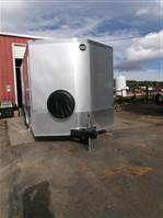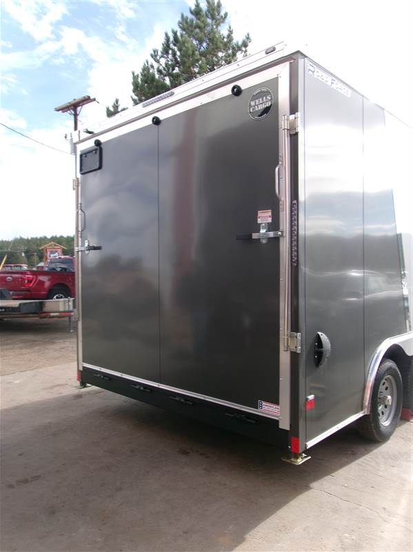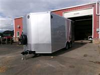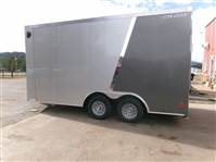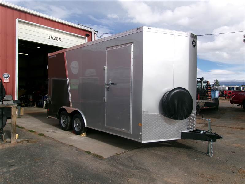 REDUCED: 2026 16' Enclosed cargo trailer by Wells Cargo (Model Road Force V), measures 8'6”W x 16'L (square section), 18” V-nose front (extra foot inside), rear ramp door with 16” ramp extension, 7'6” inside height, 36” wide side door with RV handle and bar lock assembly, , 2' stone guard, LED lights, sidewall vents, 2 LED dome lights with wall switch, tandem 3500# axles with easy lube hubs, electric brakes on both axles, GVWR - 7000#, Payload = 4420# (trailer weight = 2580#), 15" radial tires (205 75R15), matching spare tire with external mount, 4 5000# square welded corner ties, 5000# drop down stabilization jacks, exterior color = Multicolor – Silverfrost and Charcoal Gray.