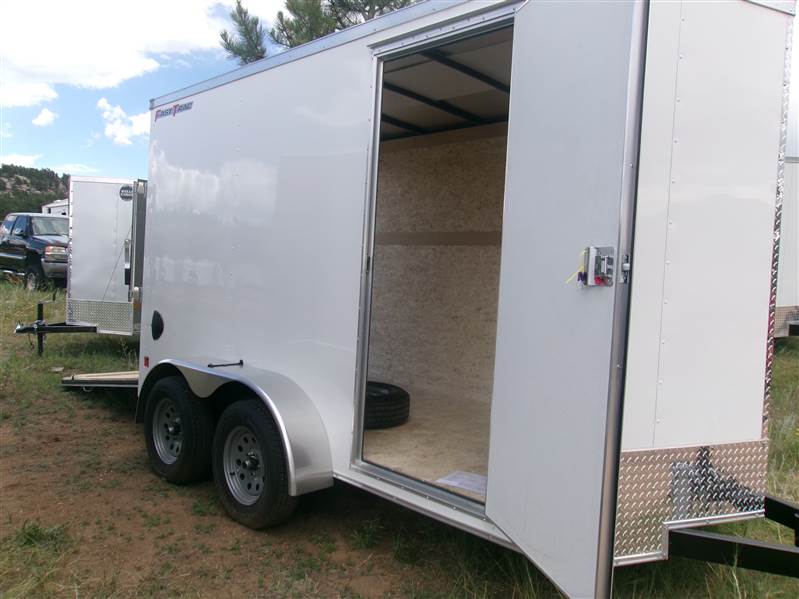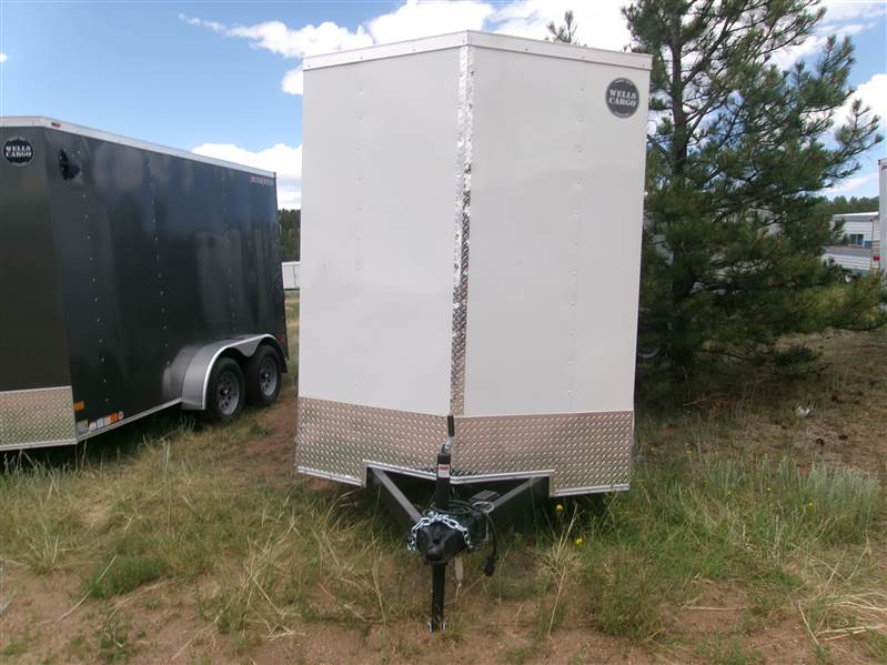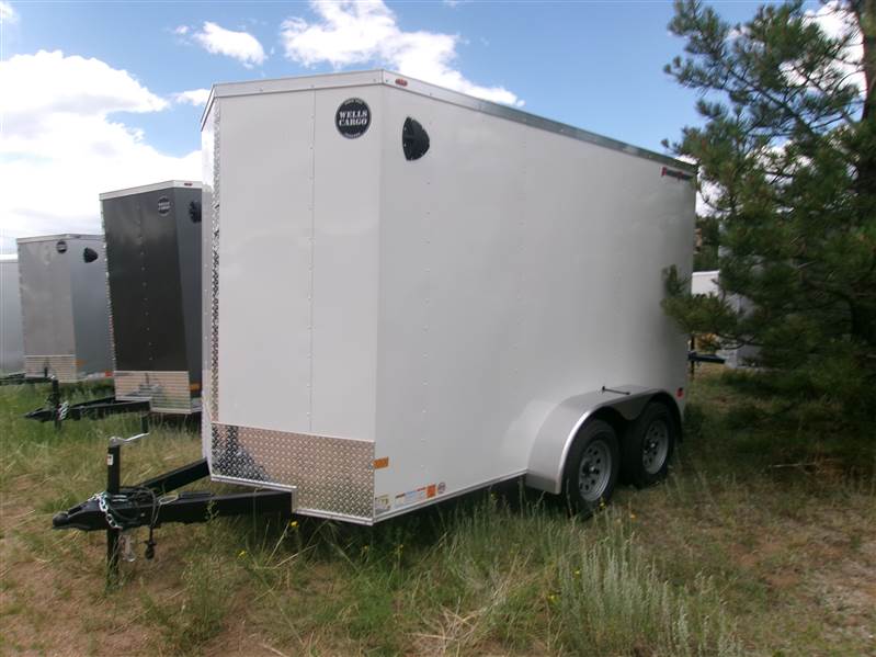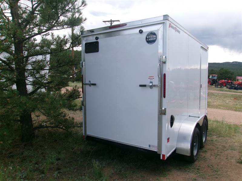 REDUCED: 2026 12' Enclosed cargo trailer by Wells Cargo (Model Fast Trac Deluxe), measures 6' x 12’ (square section), 18” V-nose (extra 1' inside), 7’ internal height, rear ramp door, 32" side door with RV door latch, deluxe finish (0.30 exterior wall, 3/8” Plexcore sidewall, ¾” PlexCore Floor), side wall vents, dome light, 16" stone guard, tandem 3500# axles with easy lube hubs, electric brakes on both axles, GVWR - 7000#, Payload = 5260# (trailer weight 1740#), 15" radial tires (205 75R15), spare tire, 4 5000# corner floor ties, exterior color = White.