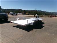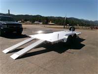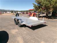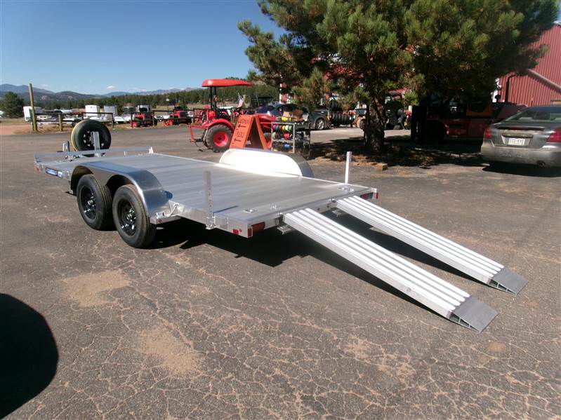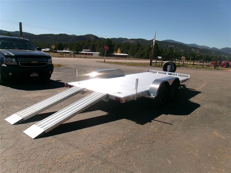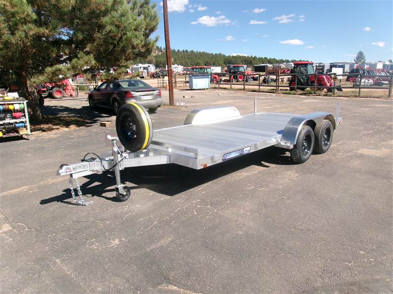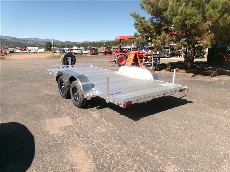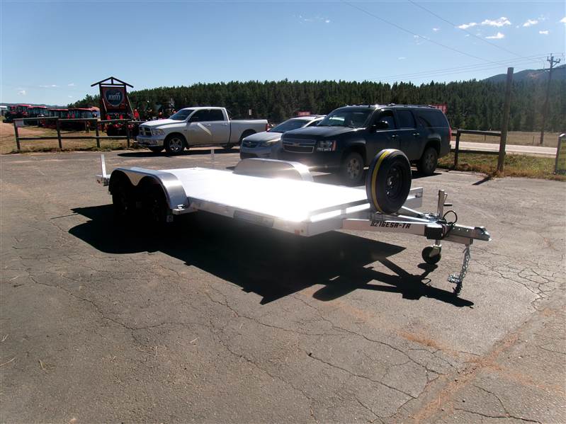 END OF FLOORING CLEARANCE SALE PLUS FREE MATCHING SPARE AND MOUNT: 2026 16' Aluminum Car Hauler by Aluma (Model 8216ESA), measures 81” x 192”, extruded aluminum floor, 6’ aluminum rear ramps, 2 rear stabilization legs, removable aluminum fenders, 4 2000# recessed tie rings, 6 stake pockets (3 per side), tandem 3500# rubber torsion axle with easy lube hubs, electric brakes on both axles, 14" radial tires with black steel wheels, vertical mount with matching spare, GVWR = 7000, payload – 5682# (trailer weight - 1318#), Aluma exclusive 5 year frame warranty. This is a well built aluminum car hauler with lots of extra features.
